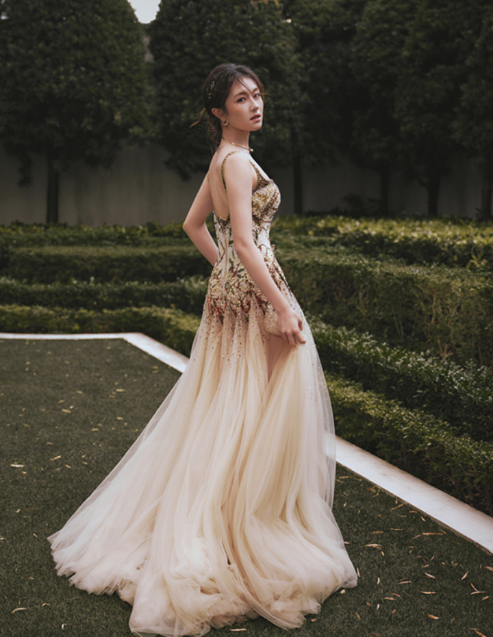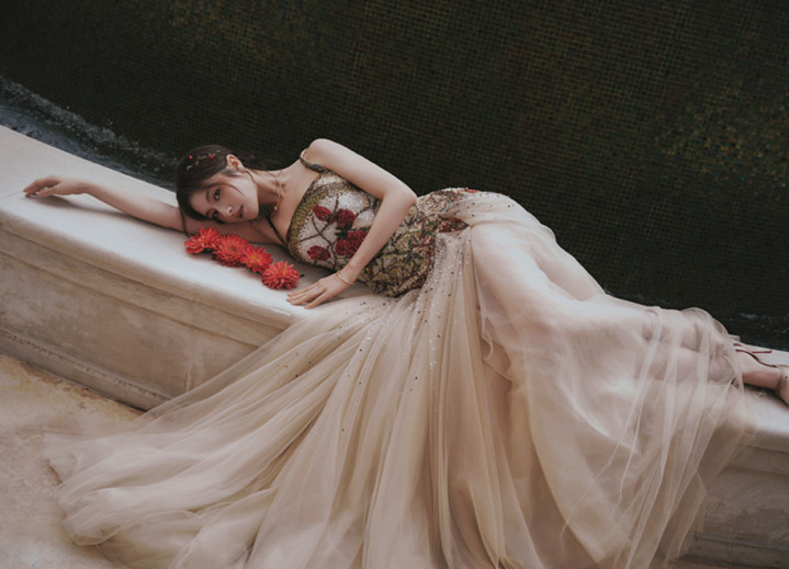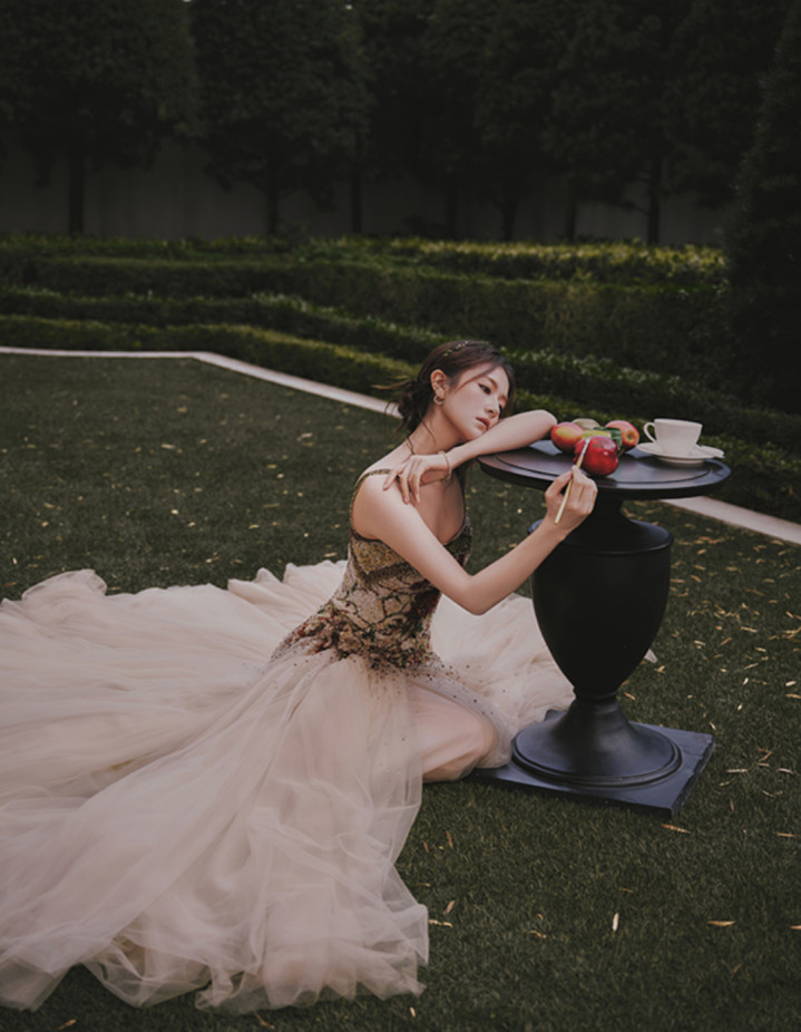 裙摆采用微蓬的A字版型,行走间随风轻扬,既中和了抹胸设计的性感,又增添了几分童话般的灵动气息。搭配简约的低马尾发型与钻石耳饰,李兰迪全程保持着从容优雅的姿态,面对镜头时的浅笑更是让整体造型甜度升级。
