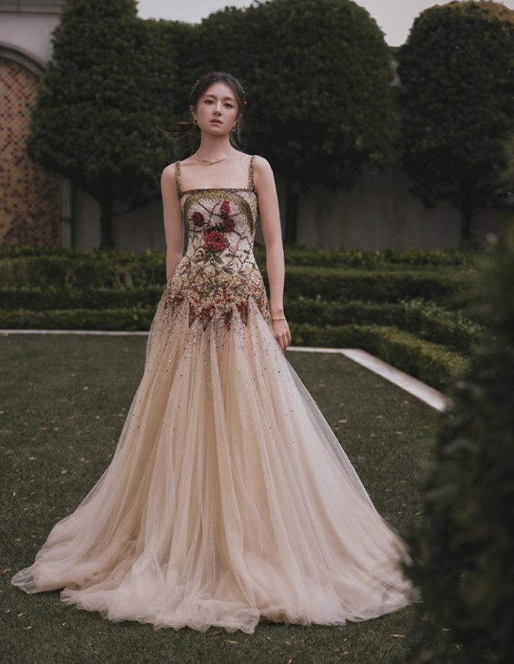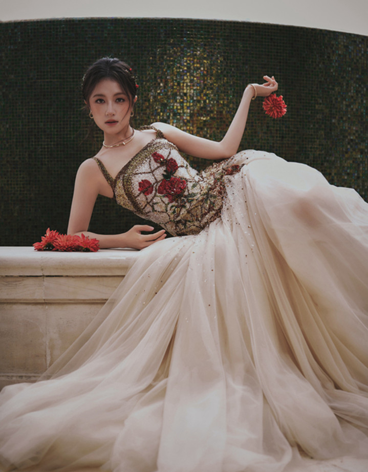 从现场曝光的画面来看,礼裙的设计亮点十足。抹胸款式精准勾勒出李兰迪优美的肩颈线条与精致锁骨,胸前点缀的立体鲜花由粉白两色组成,花瓣边缘镶嵌着细碎的水晶颗粒,在灯光照射下折射出粼粼光泽,与裙摆的亮片刺绣形成呼应,完美诠释了“闪亮”与“鲜花”的核心主题。